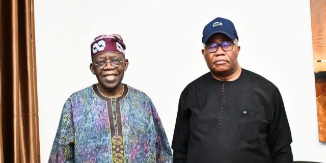 The leading contender for the position of Senate President, Godswill Akpabio, on Monday, met with President Bola Tinubu at the State House in Abuja.