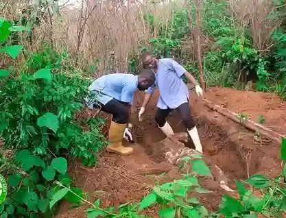 Police officers from the Divisional Police Office, Rumuji, Emohua Local Government Area worked in collaboration with members of the Emohua Vigilante Service, EMOVIS to exhume the body in the forest